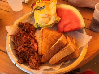 The menu was a bit odd, in that I had pulled pork which came on its own without a bun, but with some pieces of toast - which I used to make a sandwich - a giant slice of watermelon and a packet of crisps. The pulled pork was delicious though and the watermelon just the thing for a hot day. My fiancé had a chicken burger which also came with a packet of crisps rather than fries.